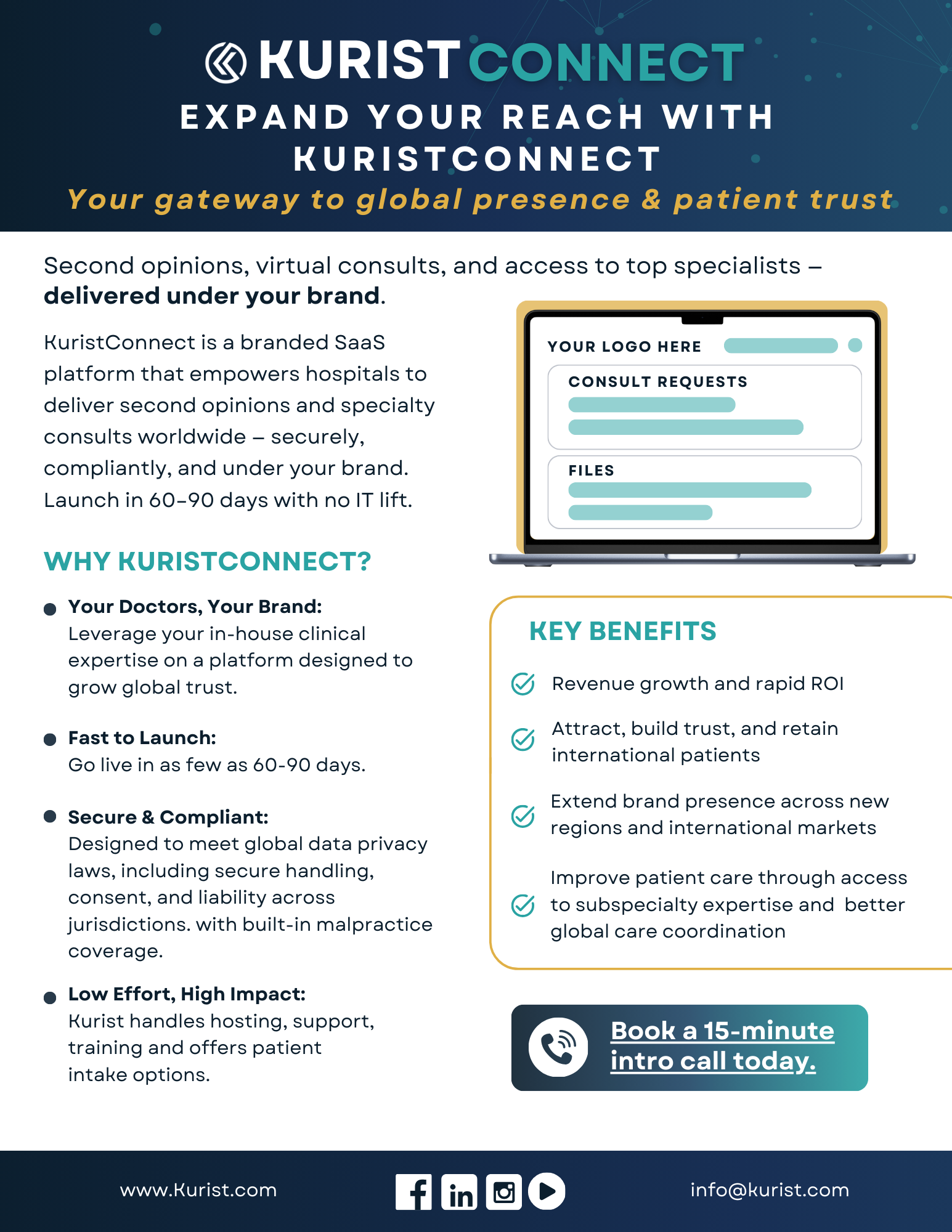 Launch your own cross-border second opinion and medical consultation program in as little as 90 days with KuristConnect. Your doctors & your brand- our secure, compliant platform. Your gateway to expanding your global reach, revenue, and reputation.